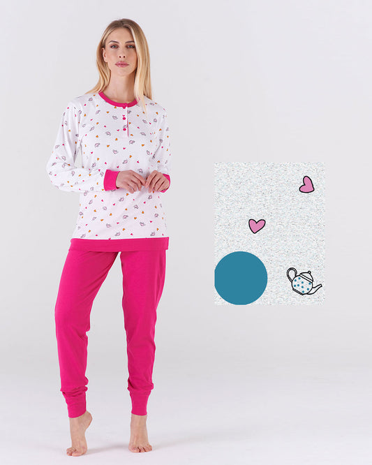 Pigiama lungo donna fantasia cuori e teiera