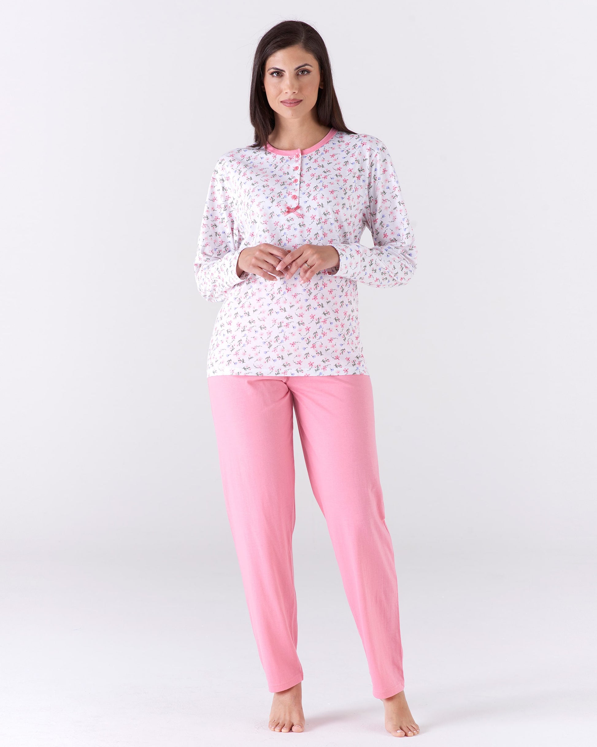 Il pigiama lungo da donna Karel in 100% cotone unisce comfort e femminilità in un design fresco e delicato. La maglia a maniche lunghe, con fantasia floreale su fondo bianco e scollo con bottoncini, si abbina ai pantaloni tinta unita rosa per un look armonioso e raffinato.